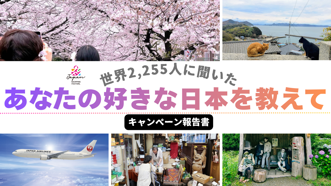 2025年12月1日(月)〜2025年12月20日(日)に実施いたしました「Japan Shopping Festival 『あなたの好きな日本の写真を教えて』キャンペーン」についての実施結果をご報告いたします。世界2,255人から寄せられた「日本のイメージ」をもとに、参加者の関心傾向や日本に対する印象を整理・分析しています。キャンペーンの概要とあわせて、今後の情報発信やプロモーションを考えるうえで参考となる内容を掲載しております。ぜひご覧ください。