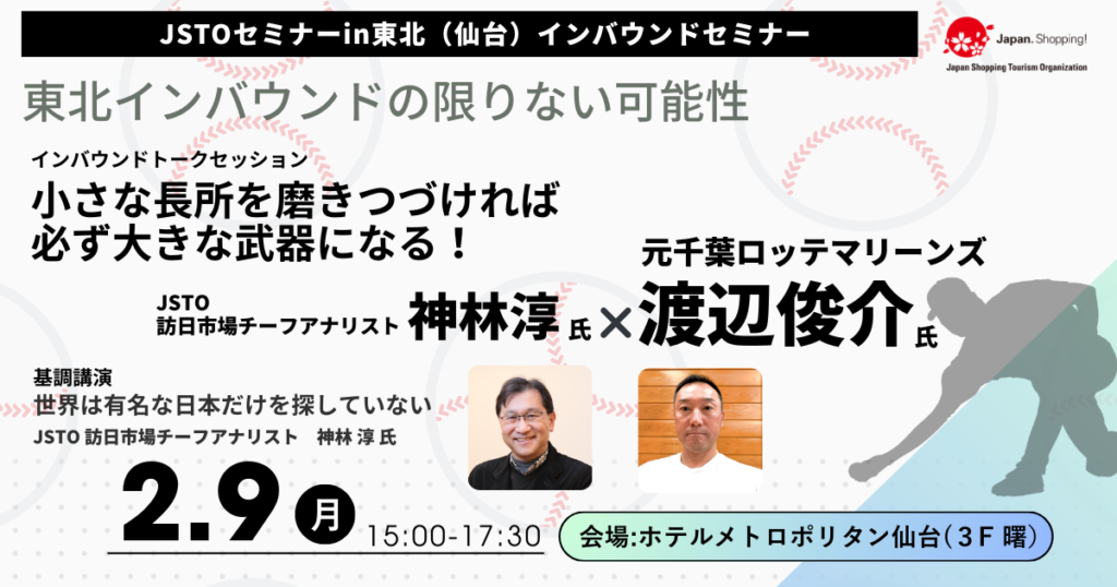 インバウンド需要が回復する今、「東北ならではの強み」をどう磨き、どう世界に届けるか。 本セミナーでは、元千葉ロッテマリーンズ渡辺俊介氏を迎え、インバウンドを“自分ごと”として考えるトークセッションを行います。 開 […]